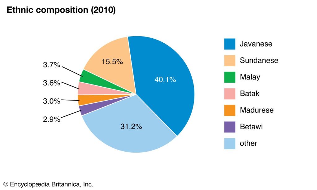 The first Europeans arrived in 1512, when Portuguese traders sought to monopolise sources of nutmeg and cloves. Dutch and British traders followed and in 1602, the Dutch established the Dutch East India Company. The politically dominant Javanese, are the largest ethnic group, constituting 40.2% of the population. They are predominantly located in the central to eastern parts of Java. The country’s official language is Indonesian, a variant of Malay. Most Indonesians speak at least one of more than seven hundred local languages, often as their first language; still, Javanese is the most widely spoken.