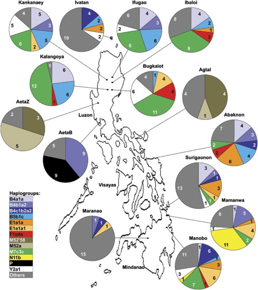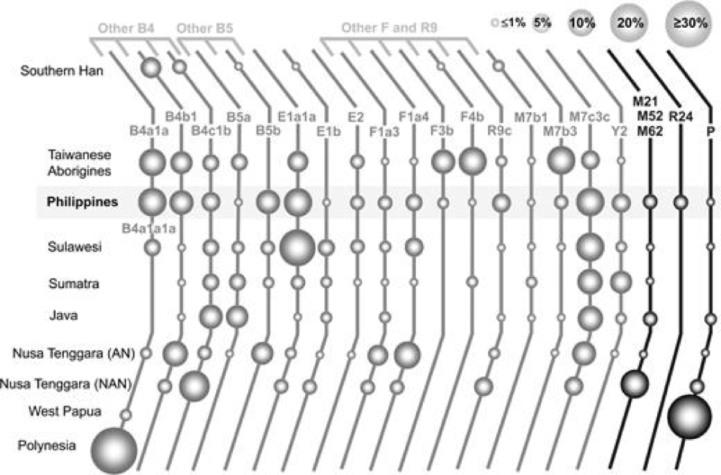 The cluster of island Southeast Asia and Polynesia mtDNA maternal Haplogroups, confirms the genetic link between Polynesia with the rest of southeast of Asia. The article also supports that migration from Taiwan to Indonesia and Polynesia went via the Philippine Islands. The most common Filipino Haplogroups include: M7c, 17.8%; B4a, 10.8%; E1a, 9.4%; B5b, 7.5%; Y2a1 5.6% and F1a, 4.7%.