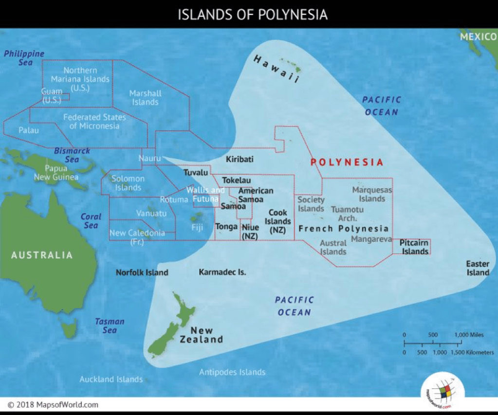 The Polynesians are spread across Oceania. The regions with significant populations include in descending order: New Zealand, 887,338; USA, 820,000; French Polynesia, 215,000; Australia, 210,843; Samoa, 192,342; Tonga, 103,036; Canada, 10,760; Tuvalu, 10,645; and Chile, 5,682.