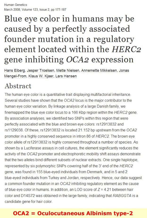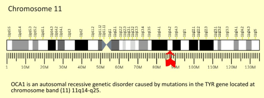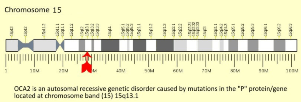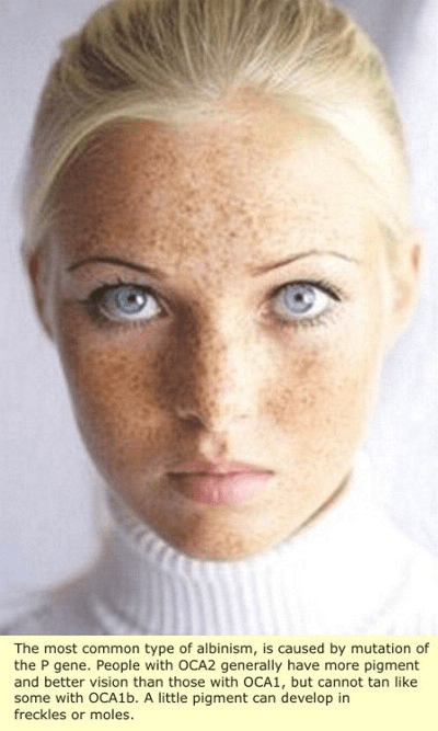 ‘The phenotype typical of type 2 Albinism (OCA2) is “TANNABLE WHITE SKIN, BLONDE to BROWN HAIR, and BLUE, GREEN, GRAY, or BROWN EYES” – sound familiar? And how is it that type 2 (OCA2) Albinos can still make type 1 (OCA1) Albinos? Simple, normal everyday European Albinism is caused by mutation of the “P” (OCA2) gene. Whereas type 1 (OCA1) Albinism is caused by a mutation of the tyrosinase gene. These genes are at different locations of the cell Chromosome, therefore one mutation does not exclude the other. Consequently type 2 Albinos producing type 1 Albinos is not unusual in the least. And just like in Blacks with Albinism, future generations are dependent only on the… partner’s mutations or lack of mutations.’