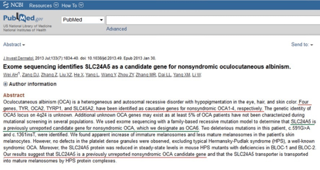 This study makes clear that is not the case: Note that this study was [conducted] by Asians. Just like SLC24A5 is a gene denoting Albinism, so too is SLC45A2, an Albino gene. What is the official name of the MC1R gene? The official name of this gene is “melanocortin 1 receptor (alpha melanocyte stimulating hormone receptor).”