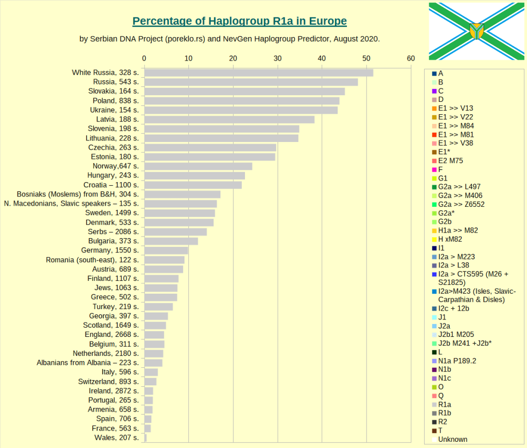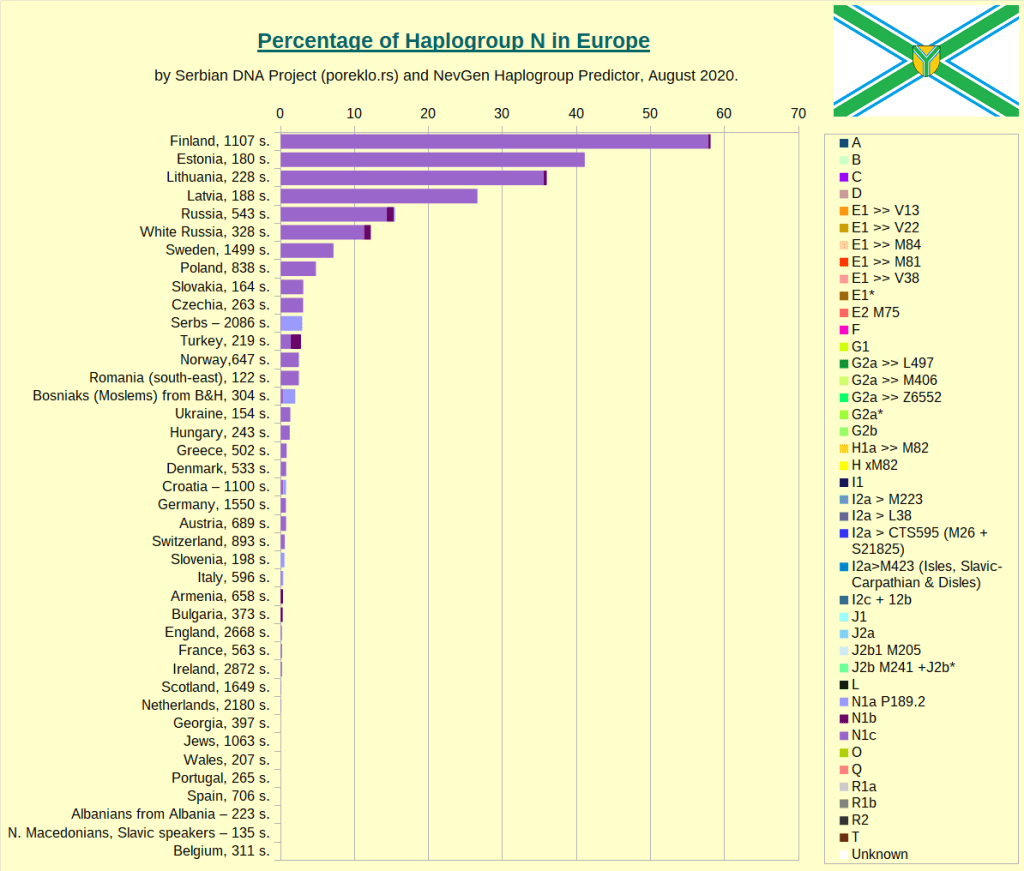 Russia: R1a [46%] – N1c [23%] – I2a1 [10.5%] – R1b [6%] – I1 [5%] –