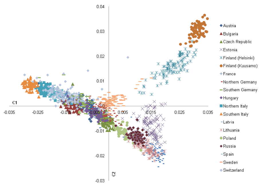Finland possess the highest levels of N1c1, while the highest percentage of I1 is found in Sweden. Switzerland retains the highest levels of I2a2. Germany and Austria have R1a percentages similar to Denmark and Sweden, while the I1 percentages for the Germans and Austrians resemble those of the Swiss, Dutch and the Flemish.