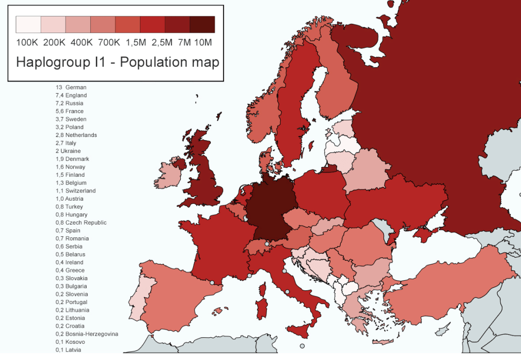 Haplogroup I1 is associated with north western Europe and the figures for Germany reflect this gradient. The higher overall percentage for Germany’s R1b at 45% is influenced by the higher population of the southern and western German states with 49% and 47% respectively.