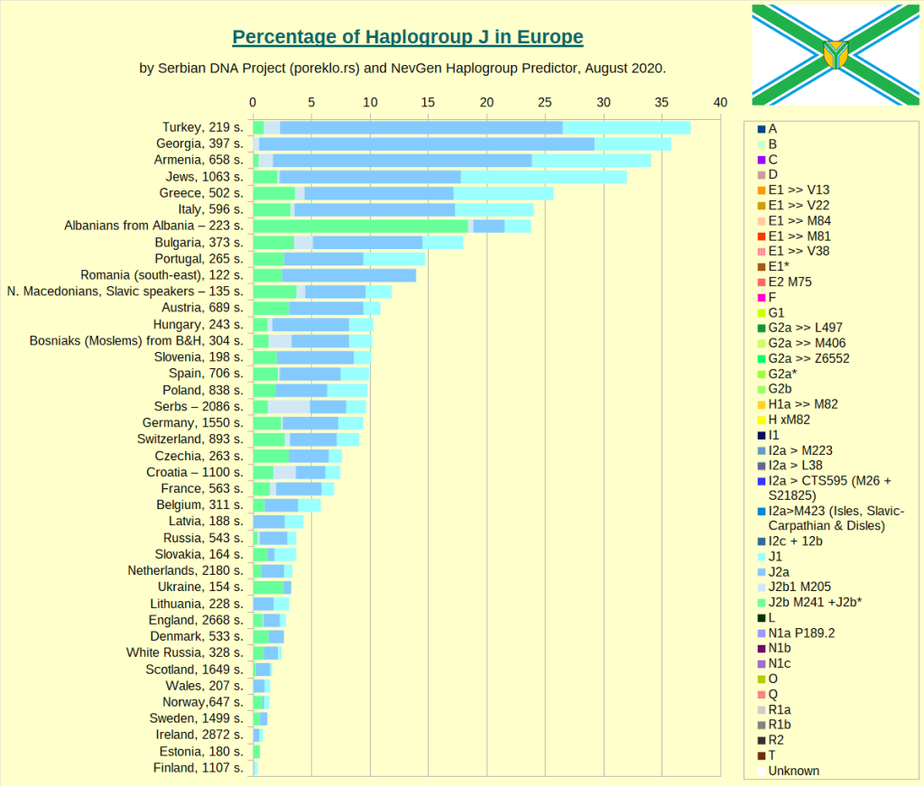 J        J1      J2     E1b1b    G      R1a     R1b      R1