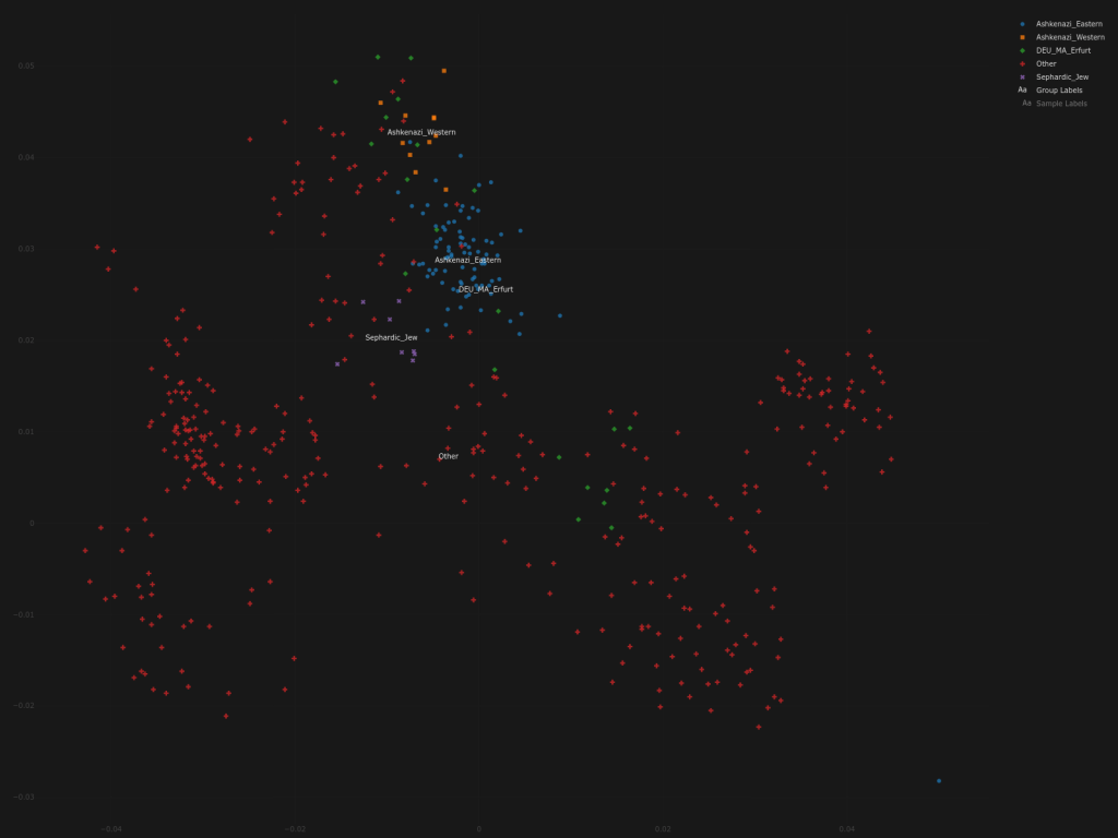 Meanwhile, the Ashkenazim are sandwiched between the Greeks and the Turks. Neither are surprising considering PCA graphs place the Ashkenazim and Greeks closely together and the Khazar Turkish connection is valid, regardless of detractor’s arguments to the contrary.