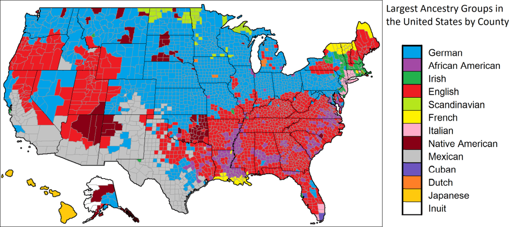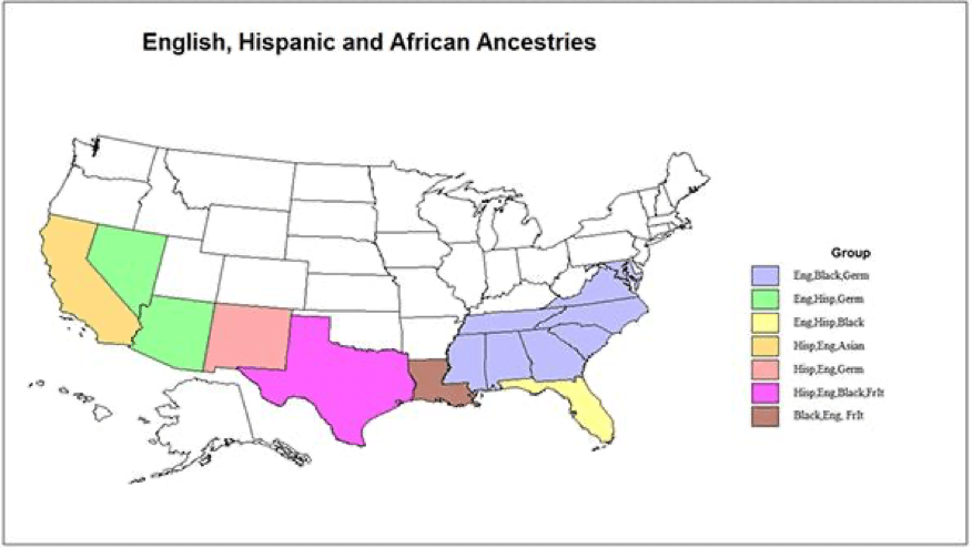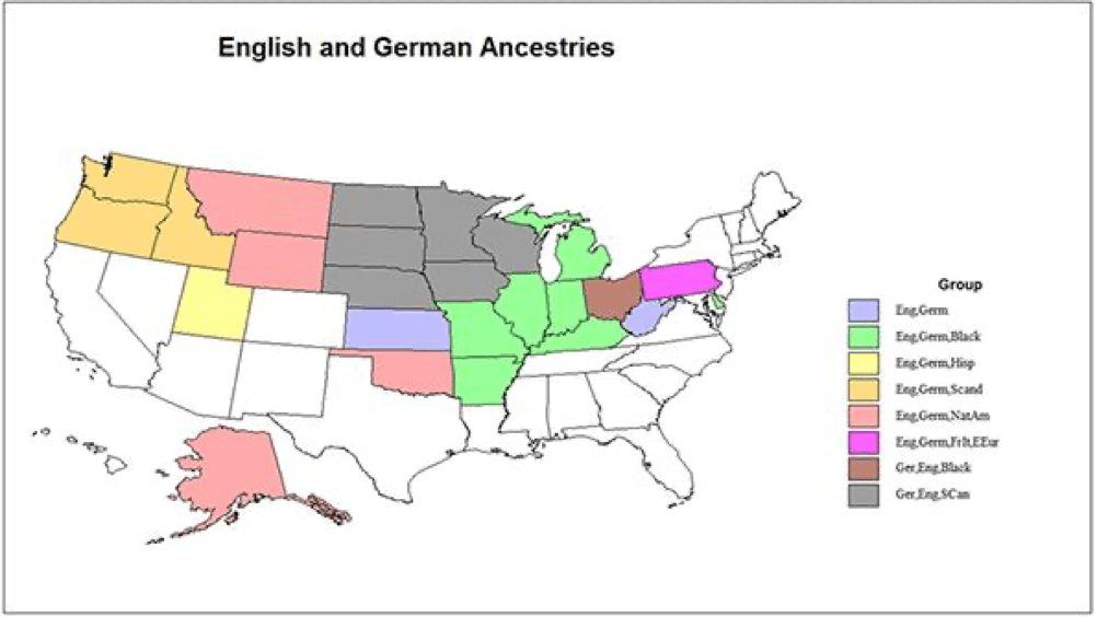 Morrill: ‘I also present a few maps of ancestry combinations. The shares of English (plus Scot and Irish), German (plus Austria, Netherlands and Switzerland) and French-Italian (plus Belgium) – all part of the R1b group, are also shown in Table 3. English and German (19 states) and German and English (7) are the most common ancestries of Americans (Map 4). English and German by themselves dominate most in KS and WV. Scandinavian is added to English-German for ID, OR and WA (which also adds Asian), and to German-English, for IA, MN, ND, SD, then together with East European for NE and WI. These 11 states are the most “northern European”. Native Americans are added most for MT, OK, WY and especially AK (now 15 states) and then a Hispanic component to CO and UT.’