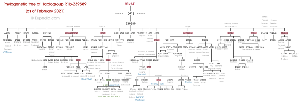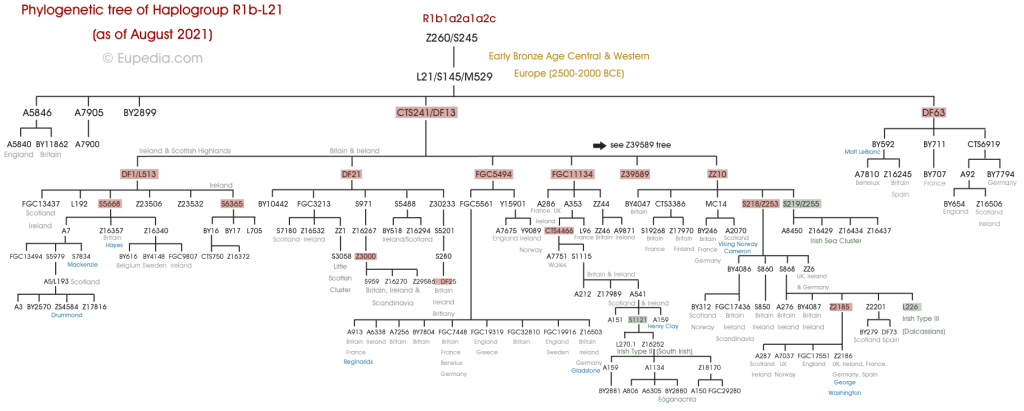 Finland is the opposite bookend, with no Haplogroup J or G2a and the lowest R1 levels. Poland exhibits the highest percentage of R1a and Spain’s total R1 is equalled by Poland, though in opposite percentages for R1a and R1b. Both England and Scotland carry a higher percentage of combined R1 than Poland and Spain and Scotland replaces Spain with the highest frequency of R1b in Europe.
