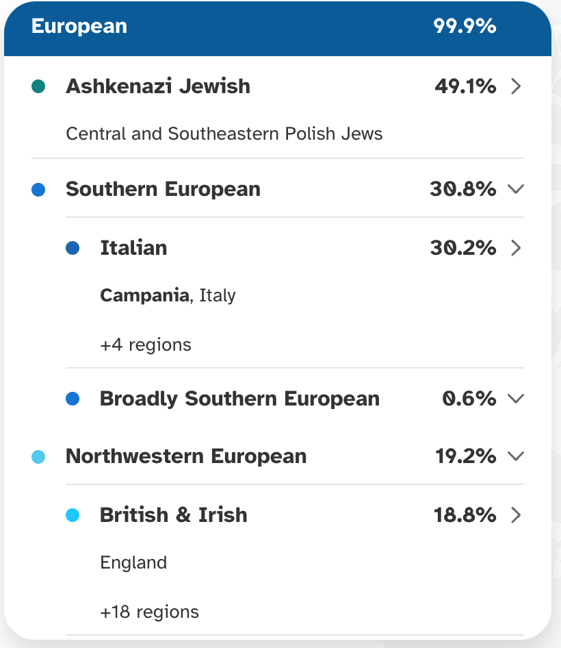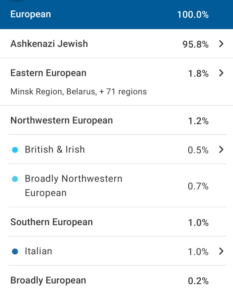 Person number five is predominately Ashkenazi Jew from eastern Europe, and Sephardic Jew has been included as European – as has Central Europe (perhaps Germany) – and not delineated as North African (1% shown beneath) or Middle Eastern. Note the inclusion of 8% Italian.