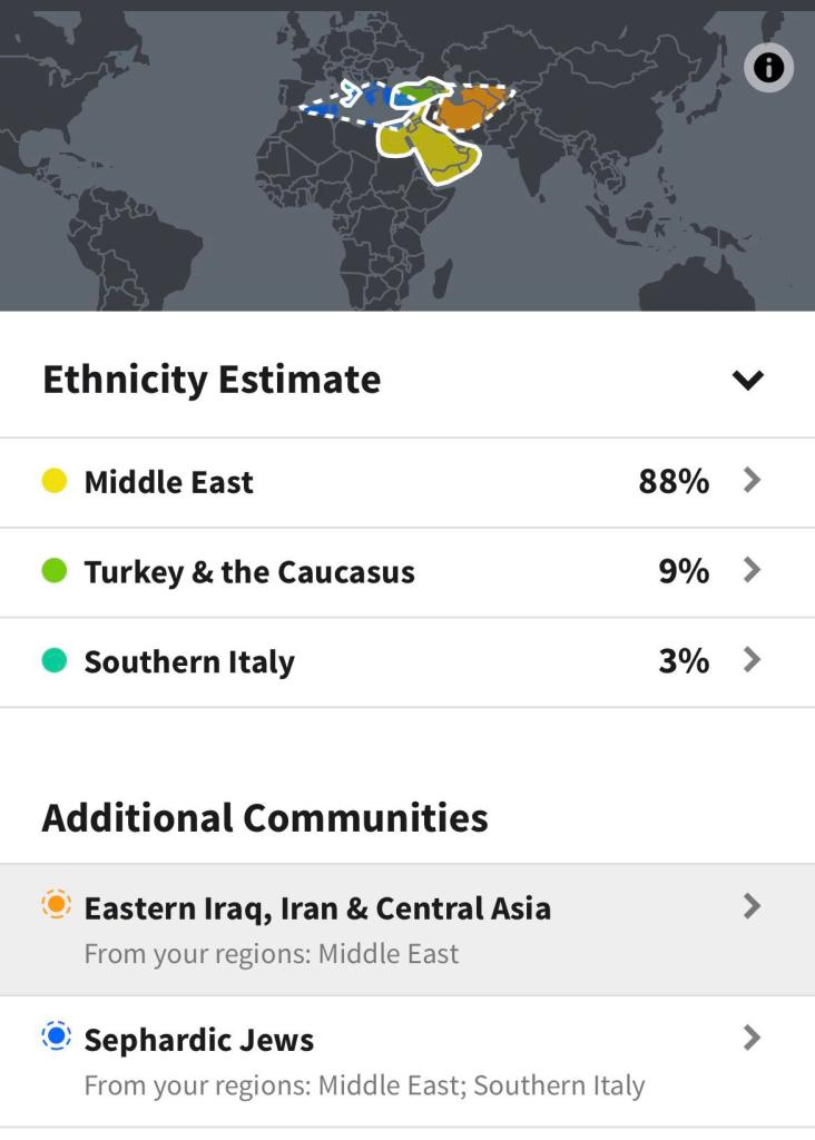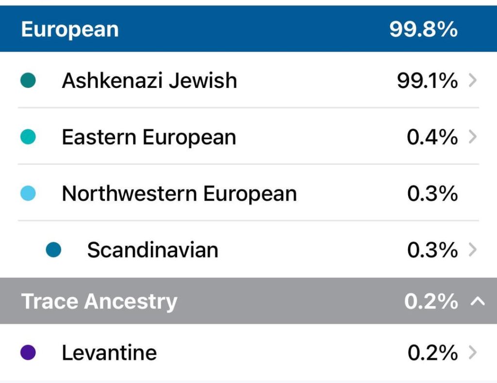 The first example shows a person with trace elements from western Europe, eastern Europe and the Middle East and is 99.1% Jewish. Confirming that being an Ashkenazi Jew is an identifiable homogenous status and not just an amalgam of different genetic lineages. Note too, that Ashkenazi Jewish is classed as wholly European and not as Middle Eastern, Iranian or Turkish for example.