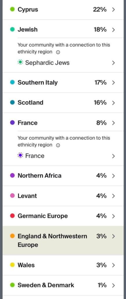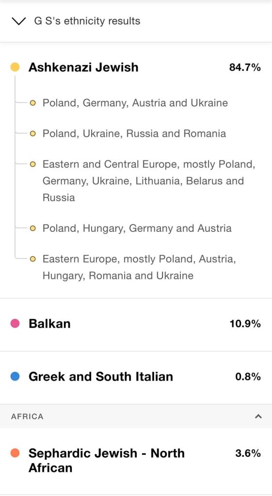 Example number three expands on the Ashkenazi percentage which is lower than the first two. Note it is eastern European driven, though Germany (Ishmael) and Austria (Hagar) figure prominently. Italian is again included even though only 0.8%. This person also has Sephardic Jewish DNA, yet classed as North African (not European). Could the German element of the Ashkenazi 84.7% be Sephardic?