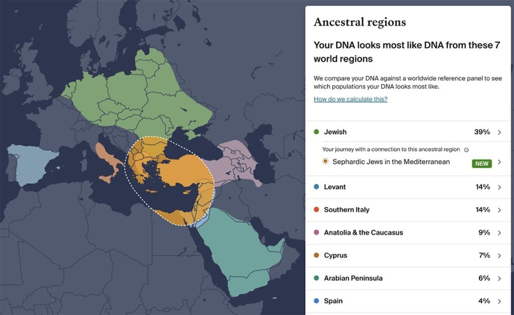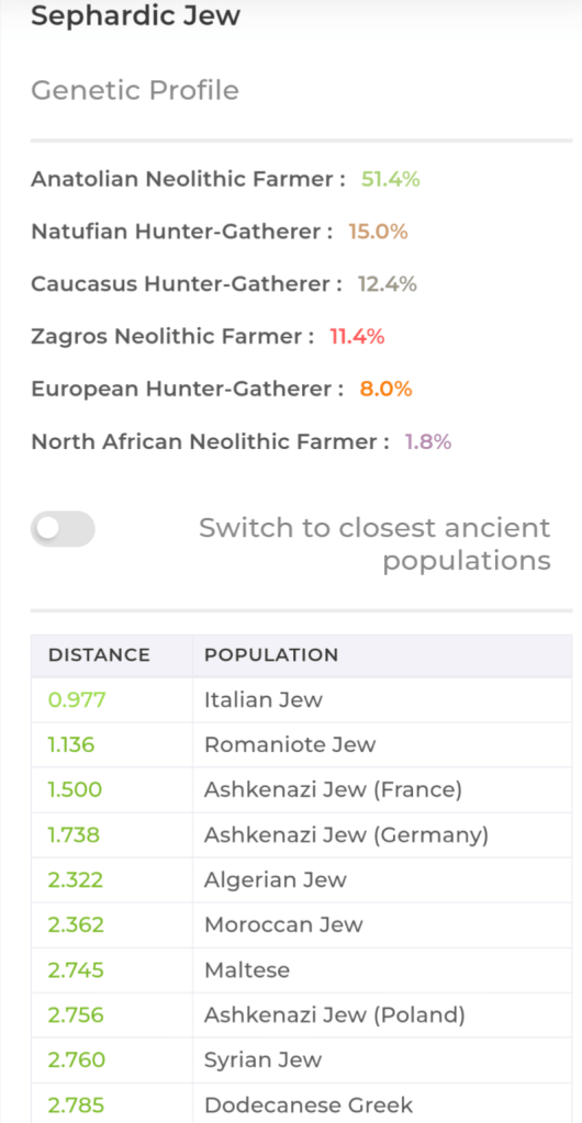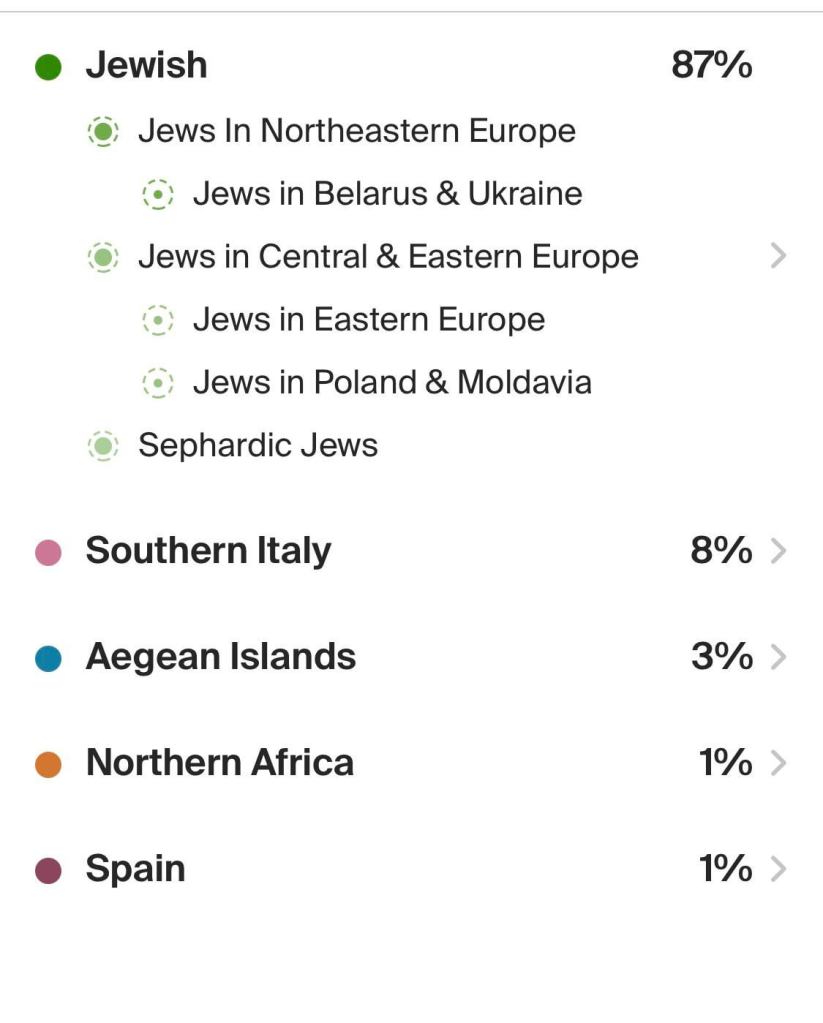Number six identifies someone who is partially Jewish from a Sephardic lineage. Though Sephardic as in Middle Eastern rather than fully European. Note once again, the 14% Italian component.