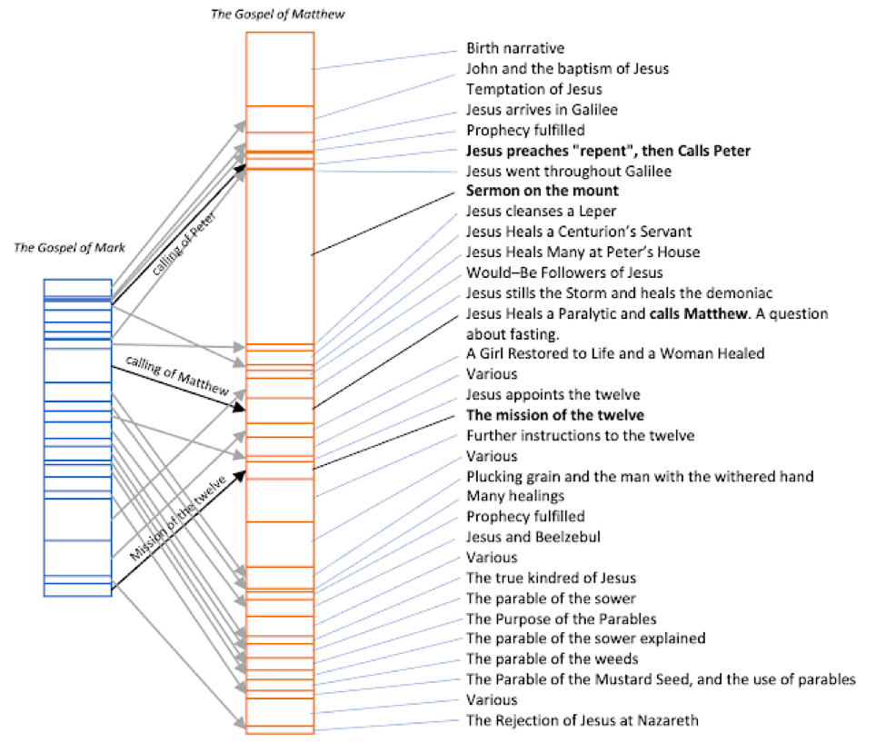 He placed a lot of miscellaneous teaching (the sermon on the mount: Matthew 5:1-7:29) immediately after the calling of Peter, Andrew, James, and John. Whereas The Gospel of Mark puts the calling of Levi/Matthew just 43 verses after the calling of Peter, The Gospel of Matthew puts 161 verses between them. Indeed, the compiler’s desire to exclude Matthew from being a witness to the Sermon on the Mount may explain why he reverses the sequence of events to make Jesus leave Capernaum immediately after the calling of the four, rather than after the healing of Simon’s mother-in-law. His source for the Sermon on the Mount material is perhaps implied by his mention of the disciples (Matthew 5:1). He further delays the calling of Matthew by rearranging his written source to put the calming of the storm and the demoniac narratives before Matthew’s calling. We can also note that The Gospel of Matthew eliminates the pronoun at Matthew 9:10 (compare Mark 2:14), so that Matthew is no longer obviously Jesus’s host. Also, at Matthew 10:3 the compiler demoted Matthew by one place.’