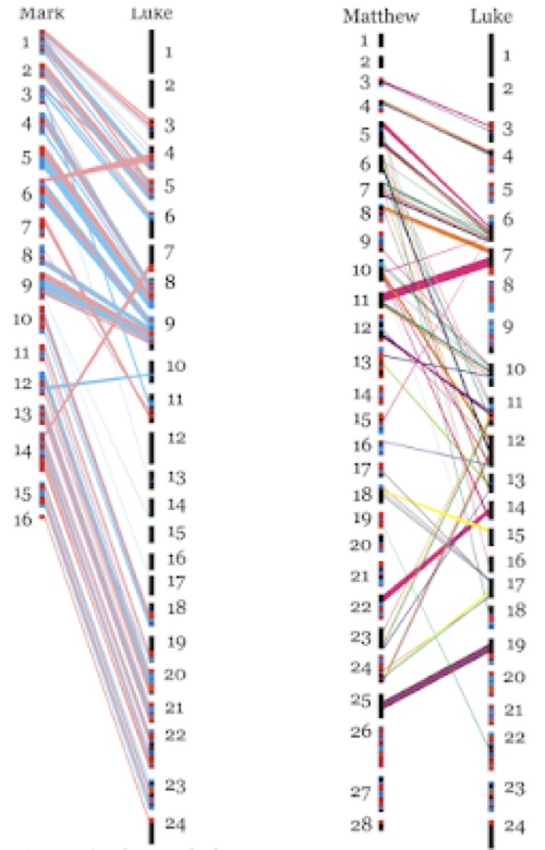 Fellows: ‘This is demonstrated by the following charts from Douglas Harder. The chart on the left shows how Luke took material from The Gospel of Mark to make his “orderly account” (Luke 1:3). Most of the erratic lines here represent Lukan pericopes that parallel their Marcan equivalents only weakly. Indeed, it has been said that Luke made only two true transpositions of material in The Gospel of Mark. The chart on the right shows how Luke took pericopes from The Gospel of Matthew that are not found in The Gospel of Mark.’