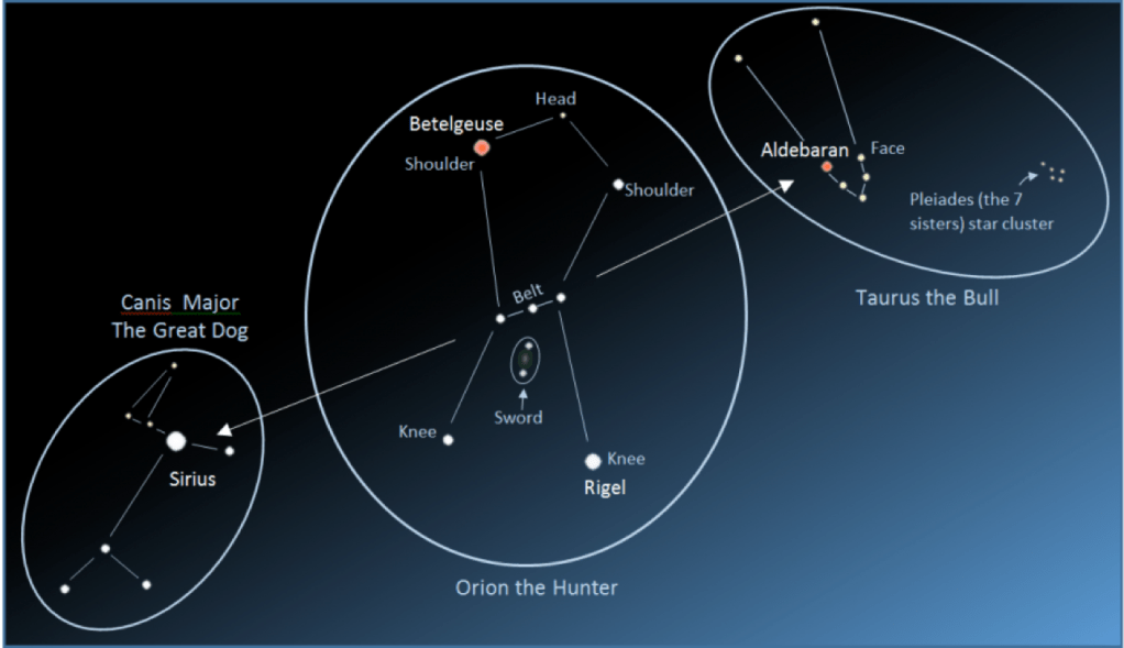 The companion of Isis was Osiris, the chief Egyptian god. The ‘companion’ of the constellation of the Great Dog (which includes Sirius) was the constellation of Orion. Since Isis is equated with Sirius, the companion of Isis must be equated, equally, with the companion of Sirius. Osiris is thus equated on occasion with the constellation Orion.